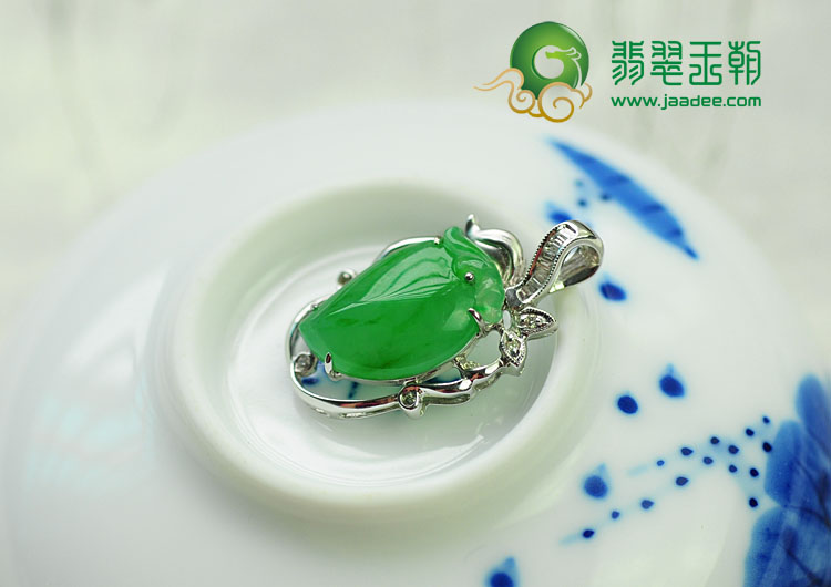 冰种苹果绿满绿缅甸翡翠包白金寿桃胸坠(真钻)