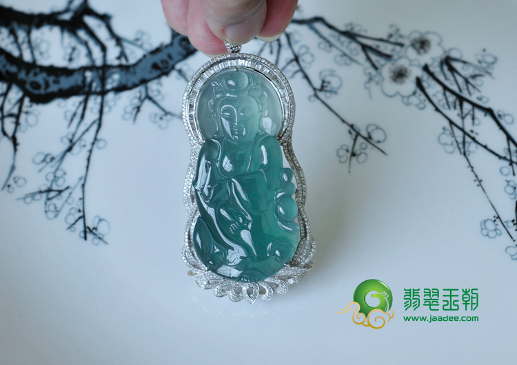 首页 >> 冰玻种蓝晴水缅甸翡翠镶白金观音挂件