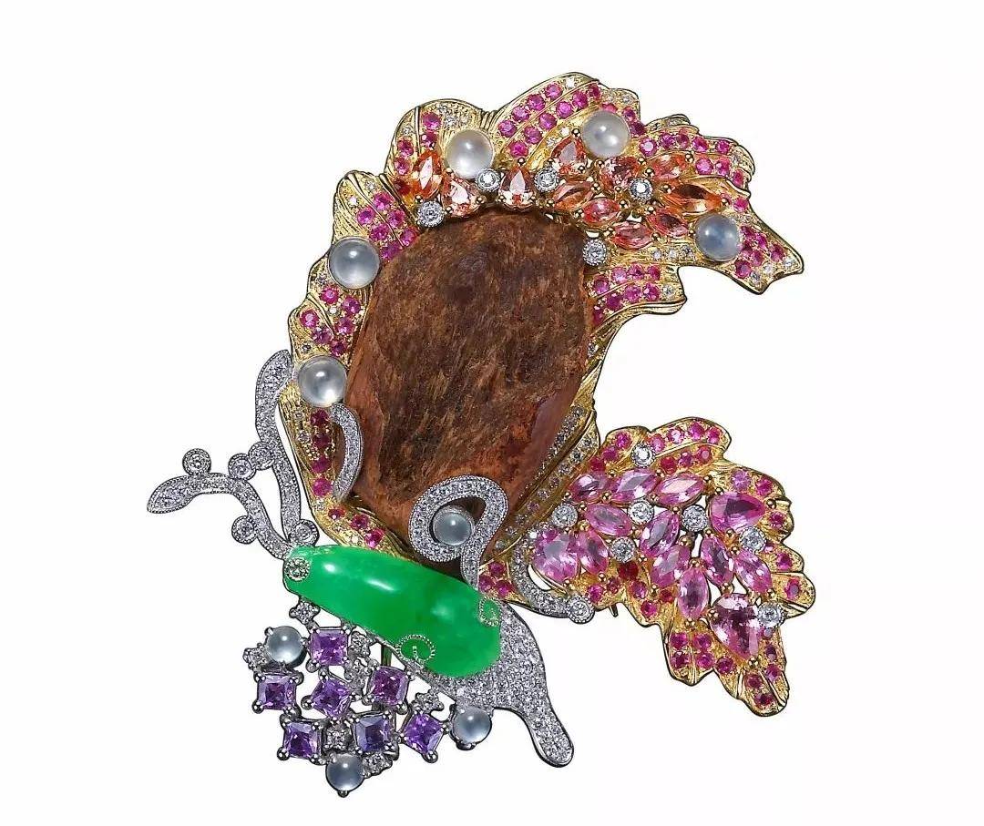 左书侨《花丝点翠镶满绿翡翠红宝石胸针》